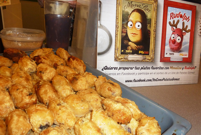 • Poner una sartén al fuego con abundante aceite. Pasar las patatas rellenas por las claras y, cuando el aceite esté bien caliente, freír en la sartén por ambos lados.